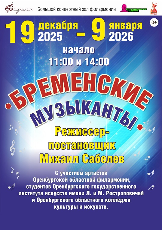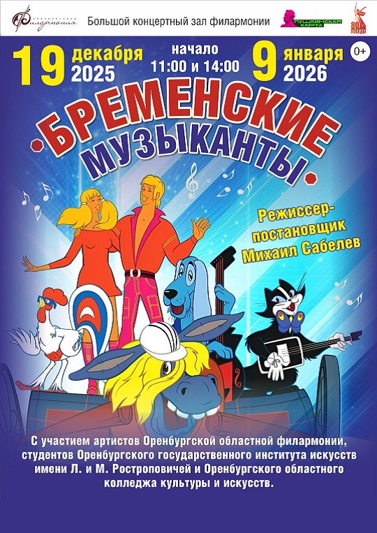 В Оренбургской областной филармонии 19 декабря 2025 года состоится премьера - «Бременские музыканты», которая обещает стать настоящим праздником для всей семьи. Это представление, основанное на знаменитой истории, знакомой многим поколениям, перенесет зрителей в мир волшебства и музыки, где главные герои — забавные и обаятельные персонажи, которые споют всенародно любимые хиты с оригинальной музыкой Геннадия Гладкова.
